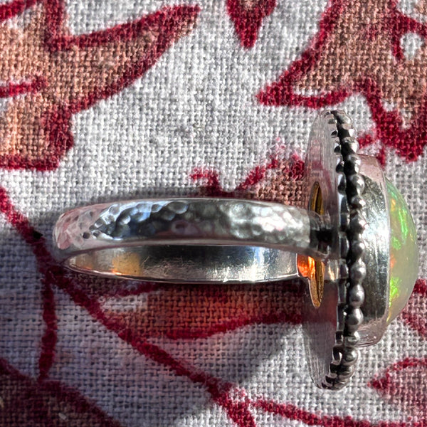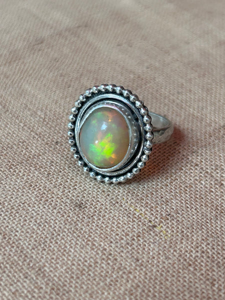 Découvrez une bague artisanale en argent 925 réalisée à la main dans mon atelier Princesses d’Argent. Cette création met en valeur une opale éthiopienne naturelle aux reflets magiques, sertie avec soin et entourée de petites perles d’argent.